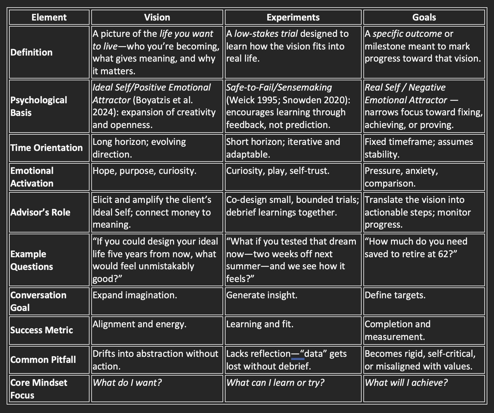 When advisors invert that order—starting with goals or problems—they unintentionally move clients into a narrower, more evaluative mindset. And that shift can shut down the very curiosity that fuels sustainable change. Vision, experiments, and goals each rely on different emotional states and invite different kinds of questions to explore them effectively.
